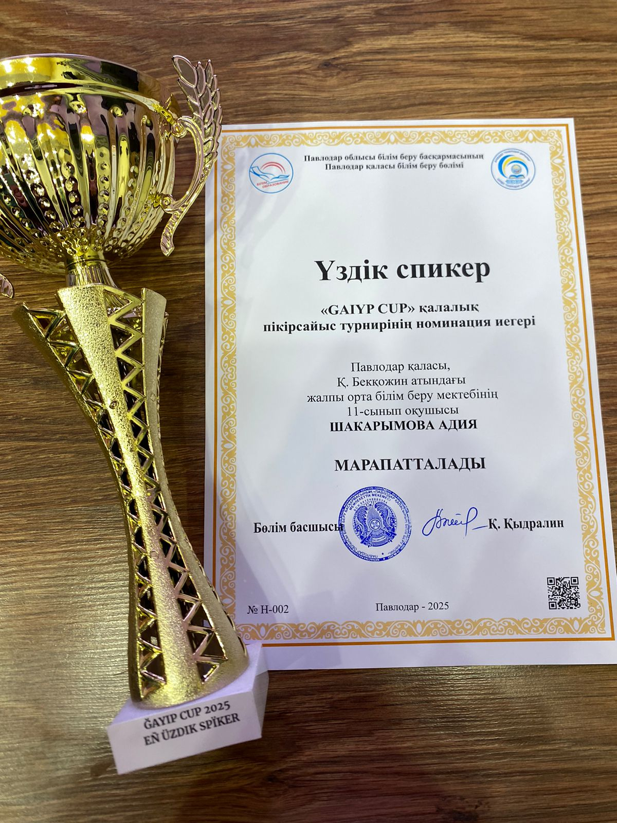 Қалалық пікірсайыс турнирінде мектебіміздің 11А сынып оқушысы Шакарымова Адия “Үздік спикер” номинациясына ие болды. Құттықтаймыз!!!