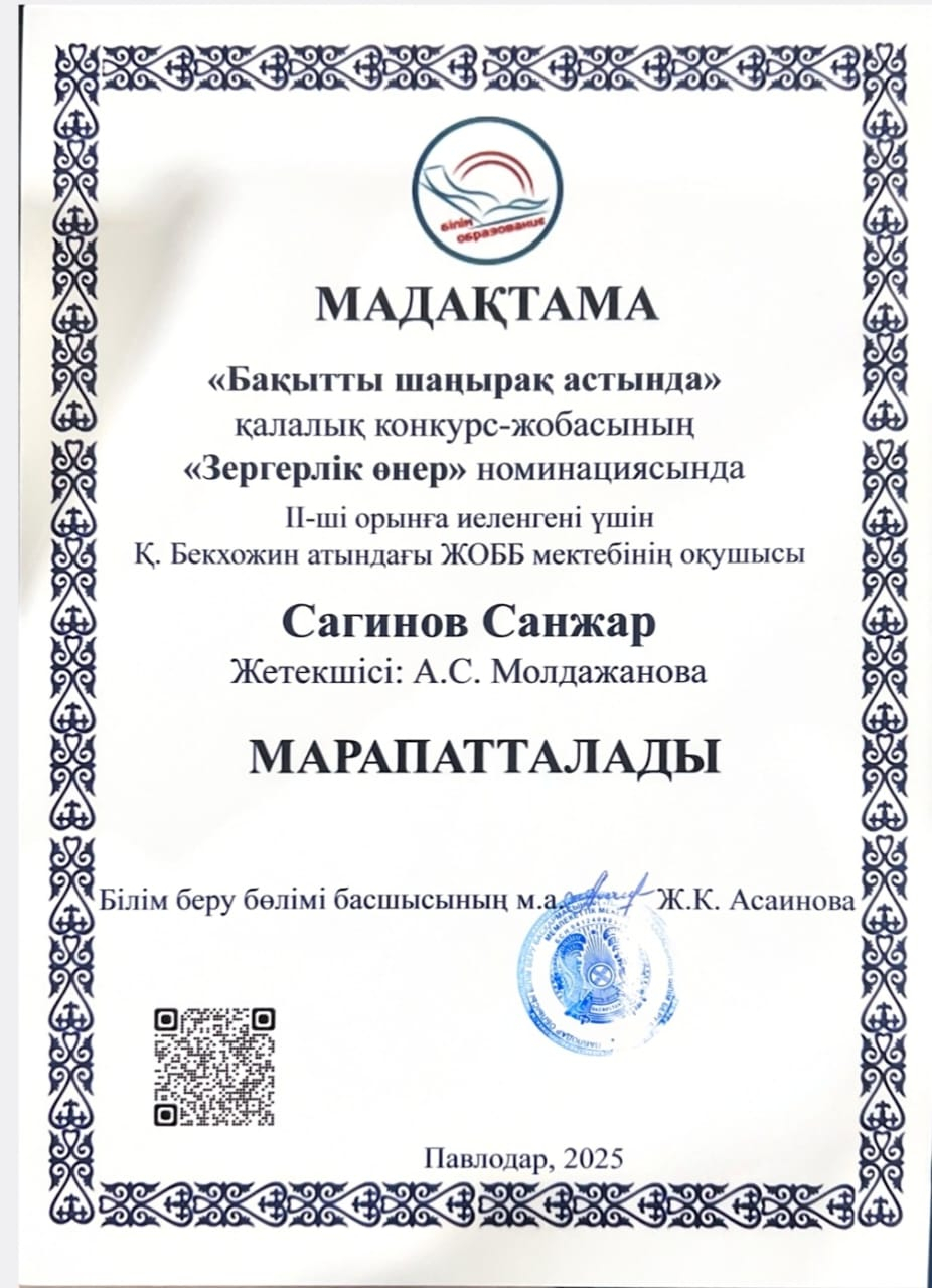 “Бақытты шаңырақ астында” қалалық конкурс-жобасы Сәуір 22, 2025 Сәуір 22, 2025 “Бақытты шаңырақ астында” қалалық конкурс-жобасының “Зергерлік өнер” номинациясында мектебіміздің 7А сынып оқушысы Сагинов Санжар 2 орынға ие болды. Жетекшісі: Молдажанова А С.