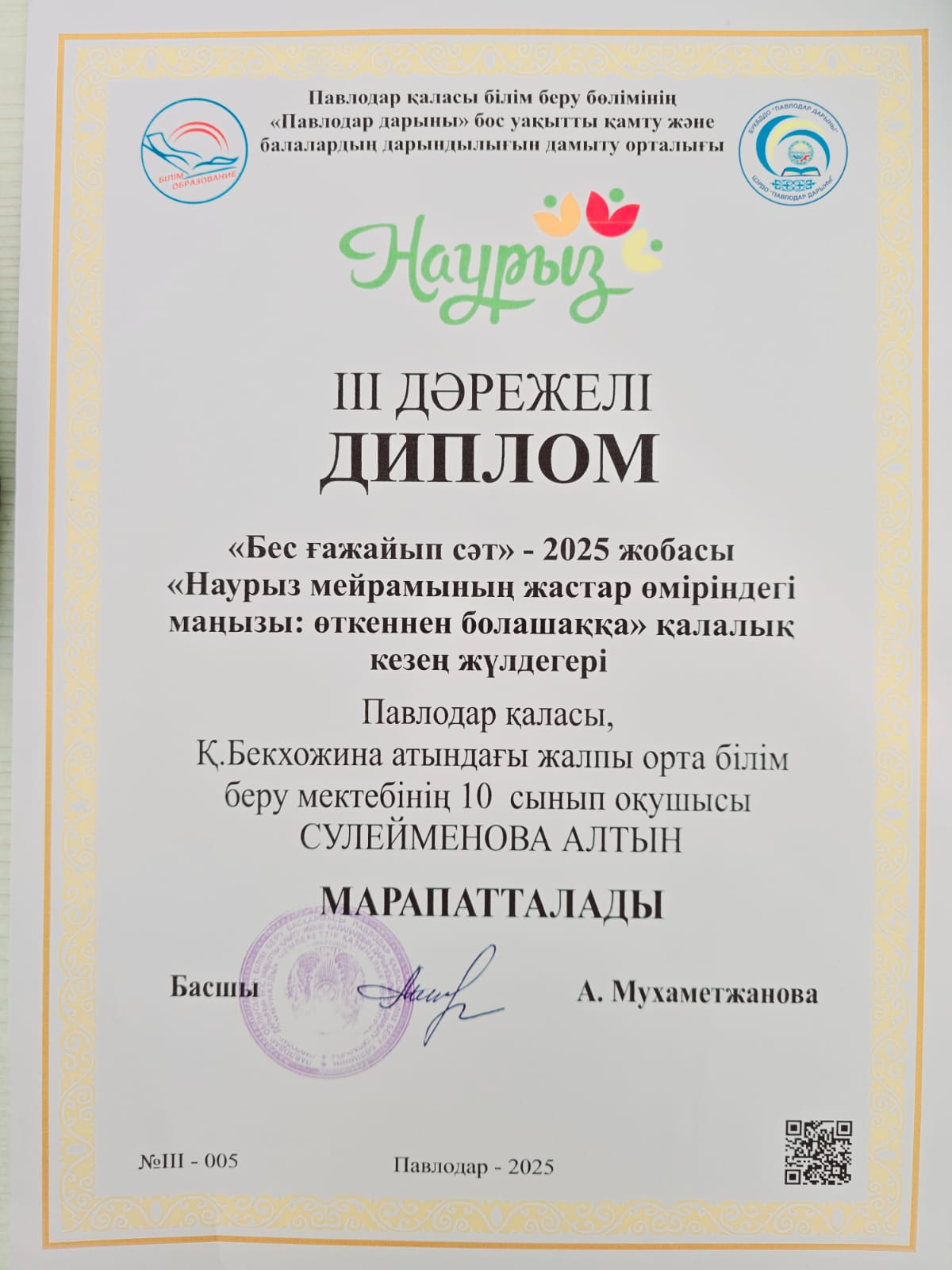 “Бес ғажайып сәт” – 2025 жобасы аясында “Наурыз мейрамның жастар өмірімдегі маңызы: өткеннен болашаққа” қалалық эссе байқауында 10а сынып оқушысы Сулейменова Алтын 3 орынға ие болды. Жетекшісі Мальшубаева Ш С.